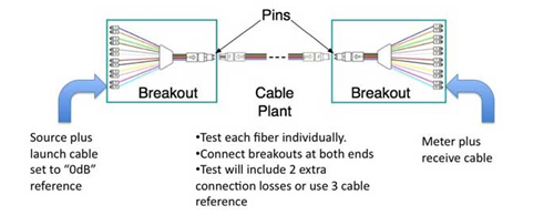Solution 1: Using a typical single fiber optic test source and power meter. In this case, you have to add MPO LC breakout cable to both MPO ends of the cable plant and then test the cable plant including the breakouts. In making the measurement this way, your loss will be higher than the actual cable plant by the loss of the connectors on the breakouts when connected to the launch and receive reference cables as shown below. This will add approximately 0.5-0.8dB +/-0.2dB to the actual loss of the cable plant under the test. You can compensate for this by using 3-cable reference (as shown in the table below) but will increase uncertainty.