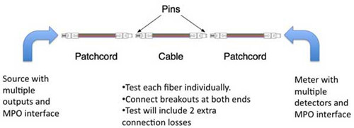 As long as testing is necessary, how can we operate the proper MTP cabling testing? Generally, testing a parallel cable plant with MPO connectors is once called impossible in an industry meeting. The problem is that few test sets have adapters for these multifiber array connectors, so you need to find ways to adapt typical single fiber test equipment to testing them. In doing so, you must compromise the typical insertion loss test by adding adapter cables from the MPO connector to LC or SC type connectors more commonly used on test equipment.